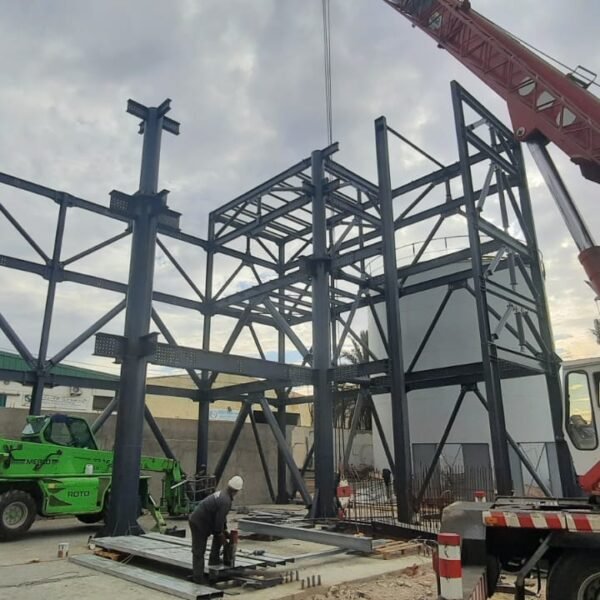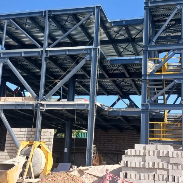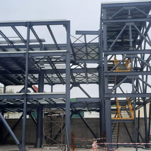 Étude d'un atelier industriel en structure métallique légère." Notre étude a porté sur la conception d'un atelier de deux étages en structure métallique, avec une charpente composée de profilés laminés à froid. Les planchers collaborants, constitués d'une dalle en béton armé associée à des bacs acier, assurent une répartition homogène des charges d'exploitation, pouvant atteindre 1,5 tonne par mètre carré. Cette solution constructive permet de réduire les délais de réalisation et d'optimiser les coûts.